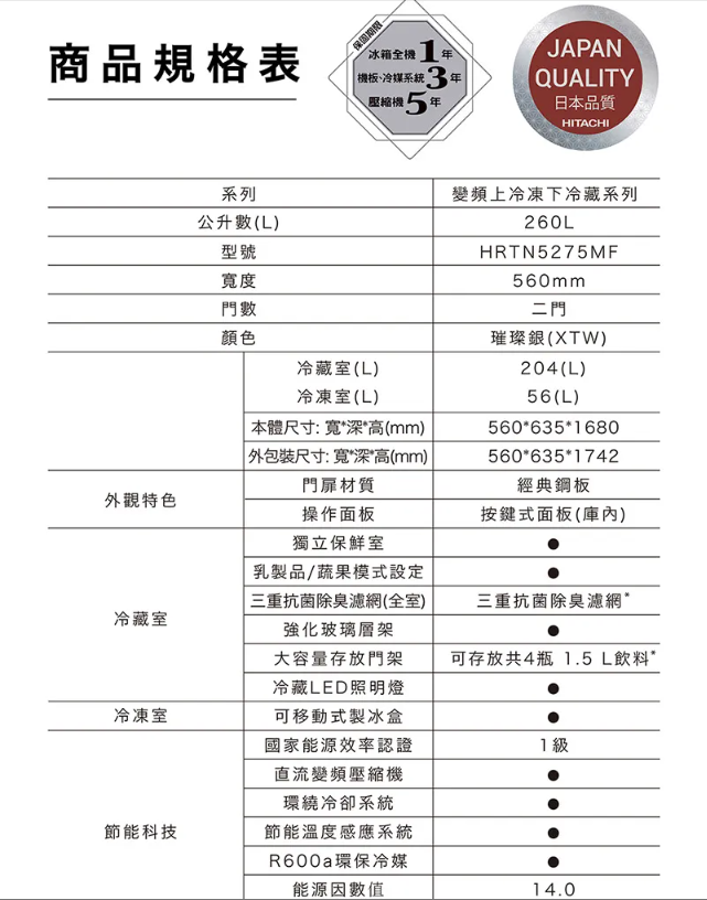 品名:HITACHI 日立 260公升Carbon Line變頻兩門冰箱 (顏色隨機)